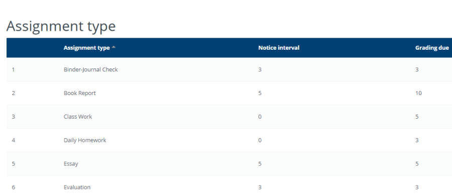 This setting determines the type of assignments for the school. The assignment type is a mandatory item to be selected when creating an assignment. In this setting, you also determine the notice interval (minimum number of days preceding the start/available date of the assignment) and grading date (maximum number of days to grade an assignment after the due date).