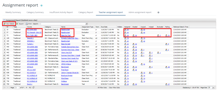 This report shows detailed information such as number of ungraded, graded, failing, excluded and missing students for each assignment. You can directly go to the assignment grading page by clicking on the assignment name or go to the course page by clicking on the course name. You can also click on Missing/Ungraded/Excluded numbers to see those students filtered on the assignment grading page and enter grades. To see the detailed student list without leaving this report, click on the "View Details" button.