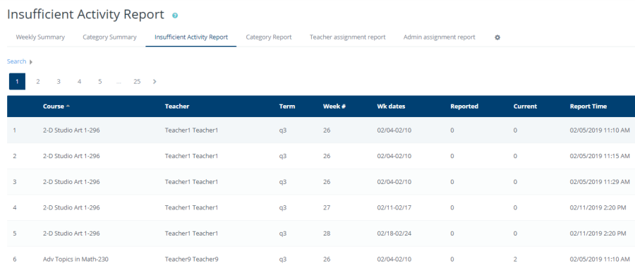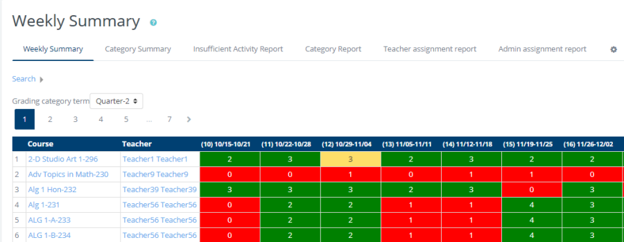 This report shows the current number of gradable activities in each week. Based on the school's assignment plugin configurations, the weeks with insufficient number of activities at the time of notification are highlighted in red. The weeks with sufficient number of activities are highlighted in green. If the teacher creates additional activities for the red weeks after the report day/time, the background will turn into yellow. You can click on the course name or teacher name to go to the "Insufficient activity report" for that course or teacher.