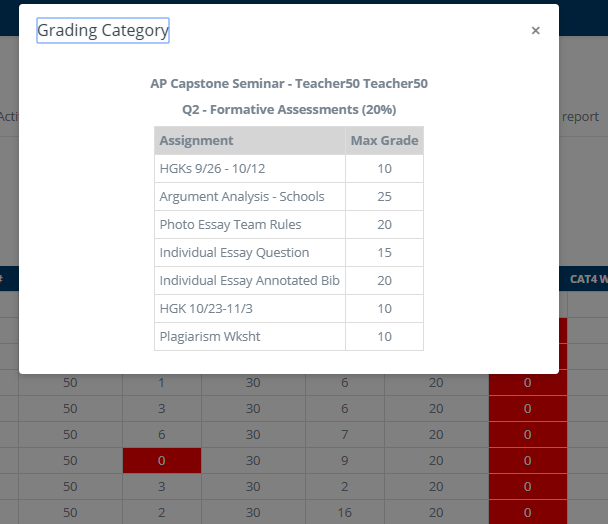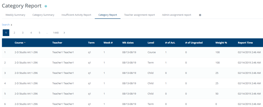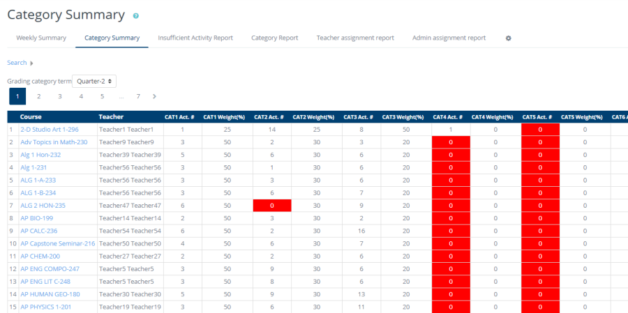 This report shows the number of activities created for each grading category for the selected term. The report shows the current numbers. Grading categories numbered as Cat1, 2, .. 5. Please click on the numbers in the table to see the detailed list of assignments with their max grades. You can use the search function to filter by course or teacher within the term. Once you click on the course name to go to the detailed category report for that course
