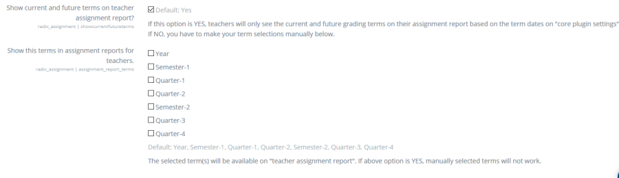 The below settings in Assignment Plugin Settings controls which terms to be shown on the teacher assignment report