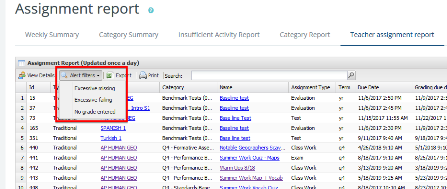 The report of excessive missing, failing or no-grade assignments can be accessed by clicking on the hyperlinks in the email. They are located on the teacher/admin assignment reports under "alert filters" menu as shown in the below screenshot.