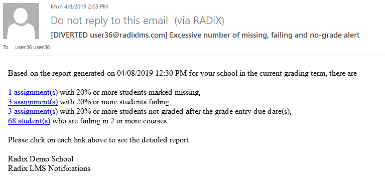These alerts sent to Principals, APs, Department heads, Team leaders and Teachers on a weekly basis based on the configurations set by the administrators. Here is a sample email notification that is sent to school administrator. In this notification, the admin receives a report for the entire school. If it was sent to the teacher or department head, the report will only include information about the courses she is teaching or the department she is managing.