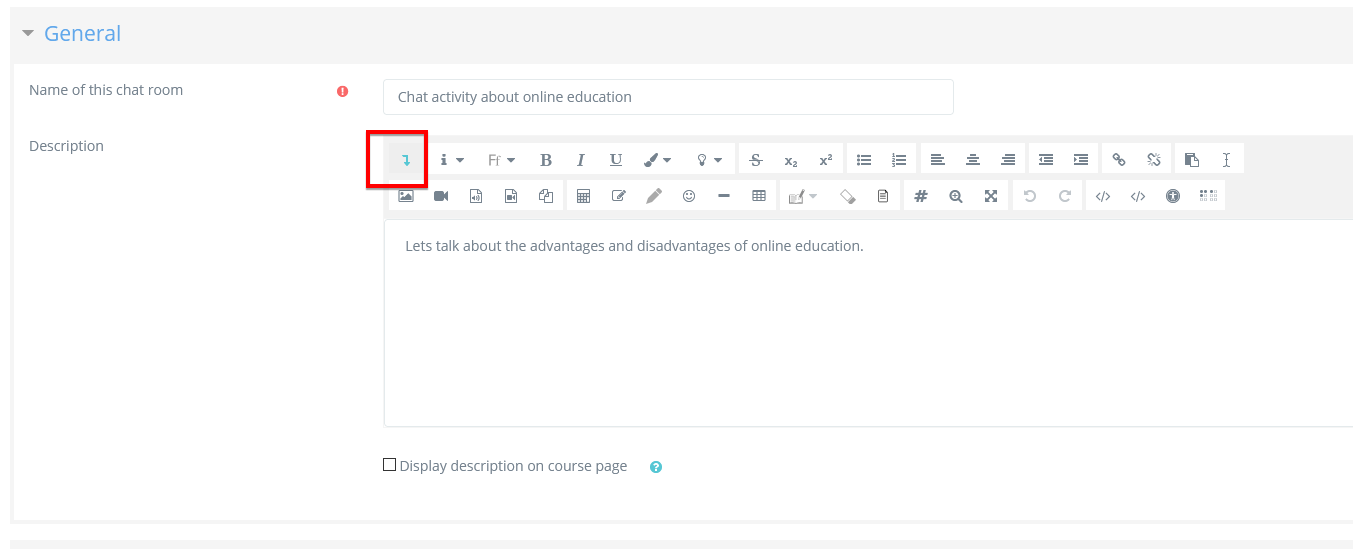 If this box is ticked, the description will appear on the course page just below the name of the Chat.