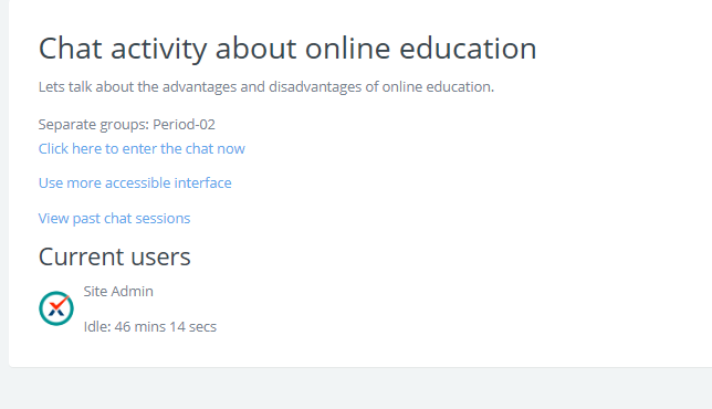 - As you click the chat link on the course page you see two or three options:- Click here to enter the chat now - this takes you to the chat using the chosen site default chat method.