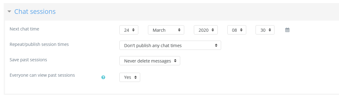 - The day and hour of the next chat session. This will appear in the calendar so students know the schedule but it doesn't stop them accessing the chatroom at any other time.