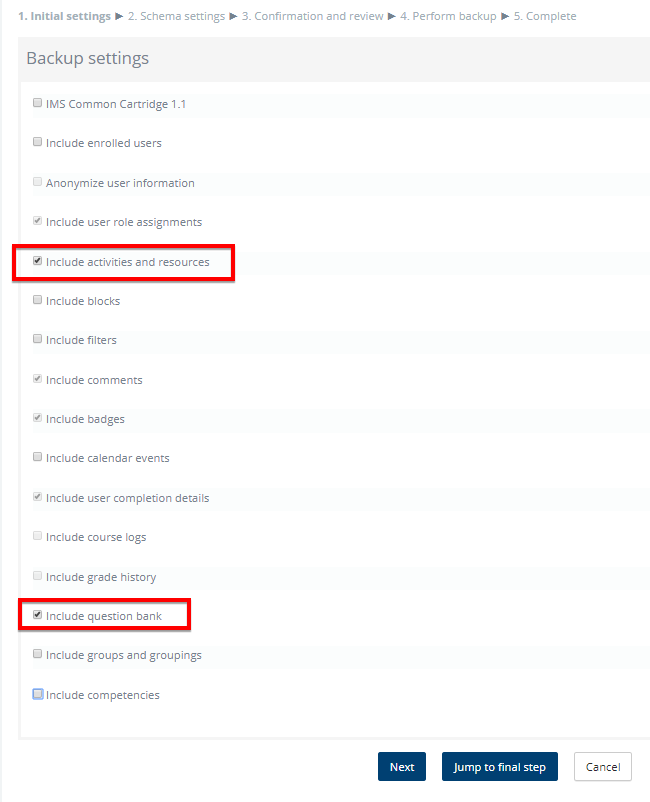 - Settings - Select activities and question bank as available then click the Next button. Since the backup file did not include anything but "Activities" and "Question bank", the other options can not be selected. Anything other than those two should be unchecked.