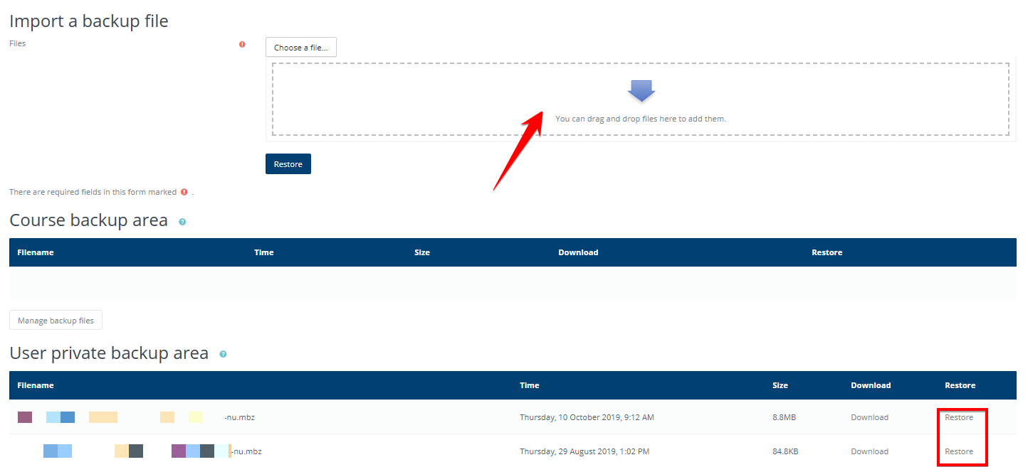 - If you are restoring content from another site, upload your backup file (.mbz) and click restore. If you are restoring content that you backed up in the same site, find the file in your private backup area and click on Restore link next to it.