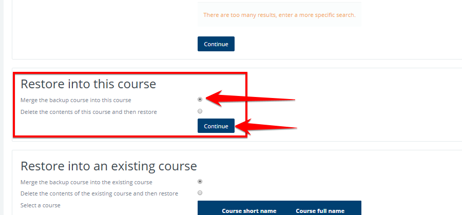 - Destination - On this page, there are three "continue" buttons and they all have different destinations as a new course, this course, or an existing course. Depending on where you want to restore the file, you will click on one of them. In this example, we are restoring a single or multiple SBA activities into this course by merging the backup course into the existing one. Since we are already in the course we want to restore the content, scroll down and find the section that says "Restore into this course". If you are an administrator, you might see all the courses on the site and have to search/find the one you are looking for.
