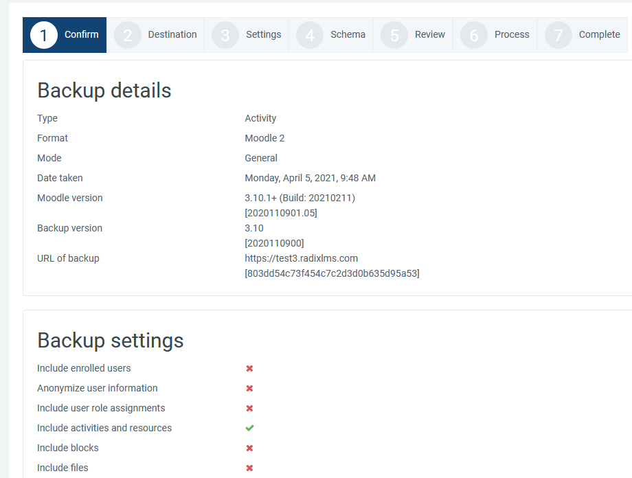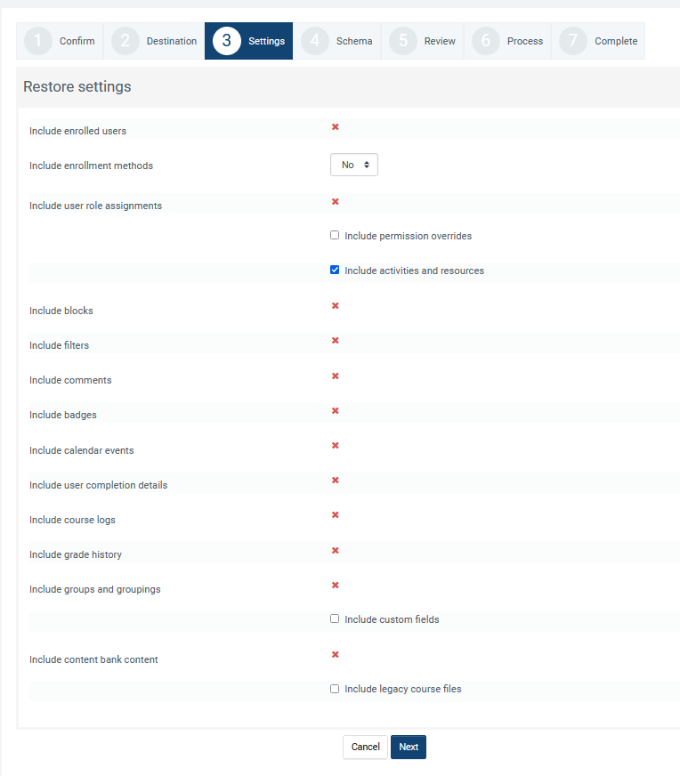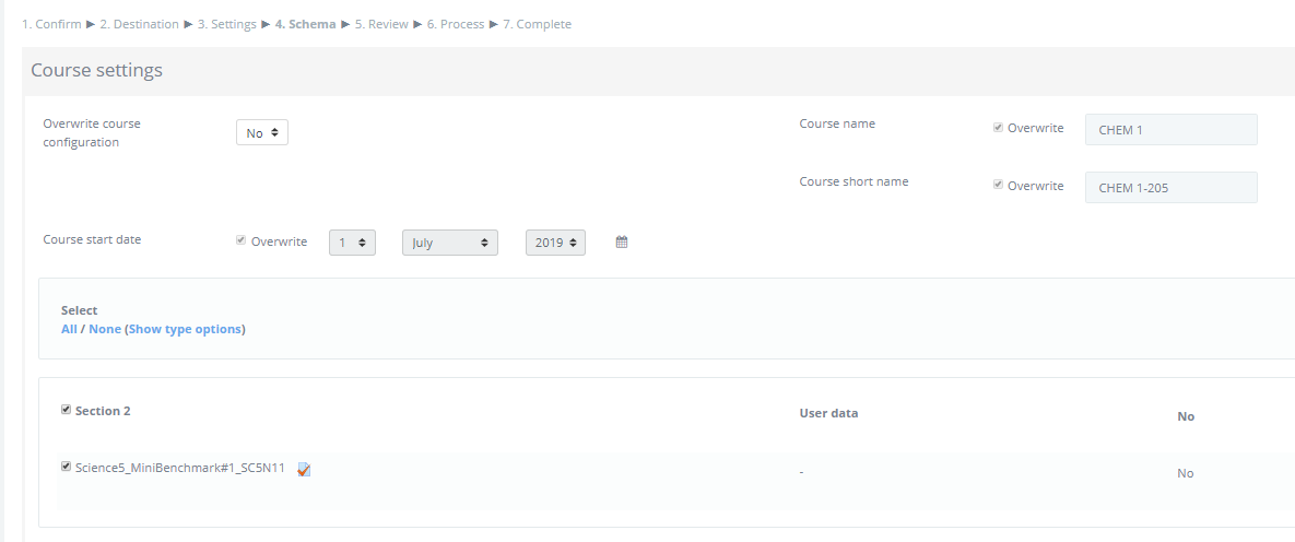 - Schema - Select/deselect specific items. Although it is possible to amend the course name, short name, and start date, do not change any of those since our goal is to restore activities to an existing course.