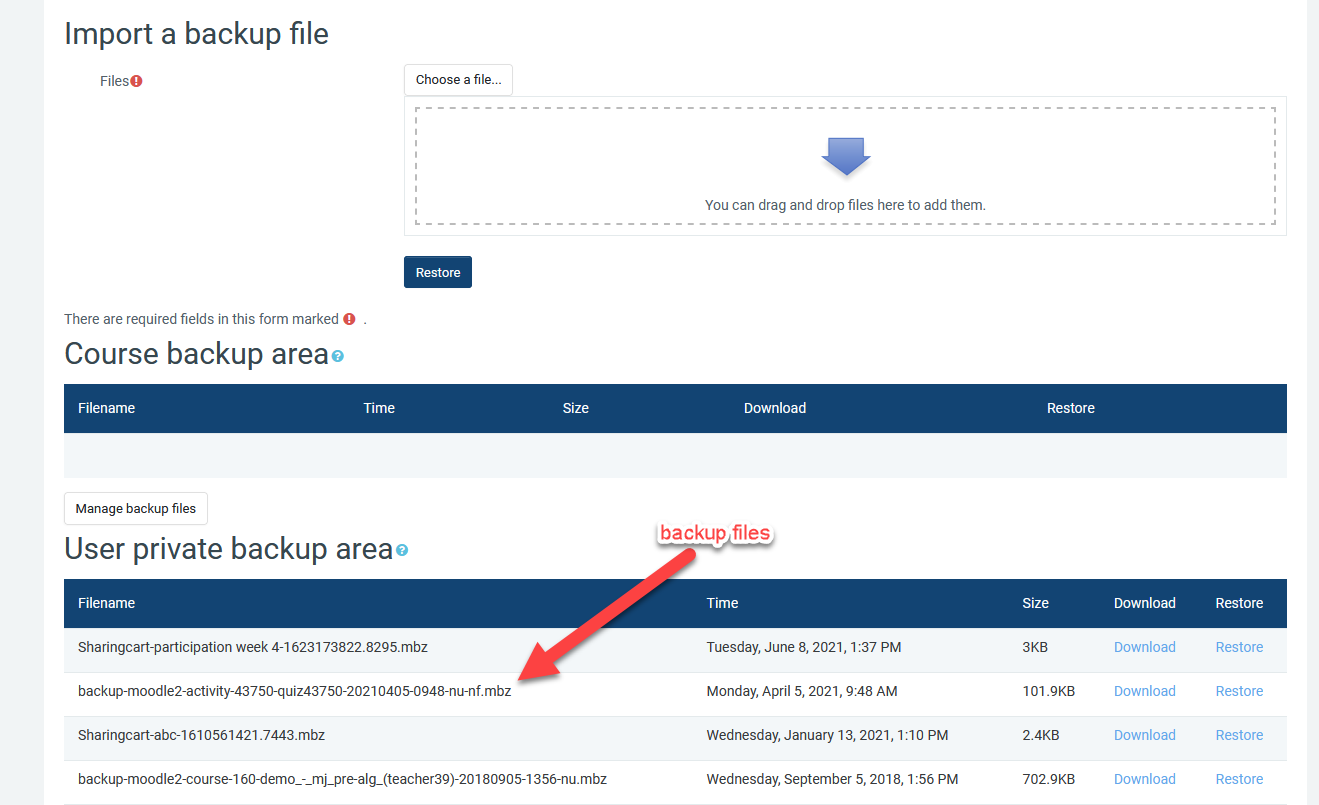 Depending on the number of questions in your question bank, the backup process may take longer than usual. To avoid that, try creating SBAs using the questions located in the course category. A backup file (with distinctive .mbz extension to avoid confusion with .zip files) is then saved in the course backup area. Backup file names are ending in -nu.mbz when backed up with no users. You can download your backup file to restore it to another Radix LMS site. If you are restoring the activities into another course on the same site, you can click on the "restore" button to start the process.