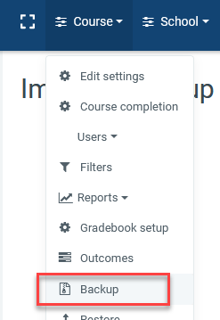 - Click the Backup link either in the gear menu or in the "Course" dropdown menu.
