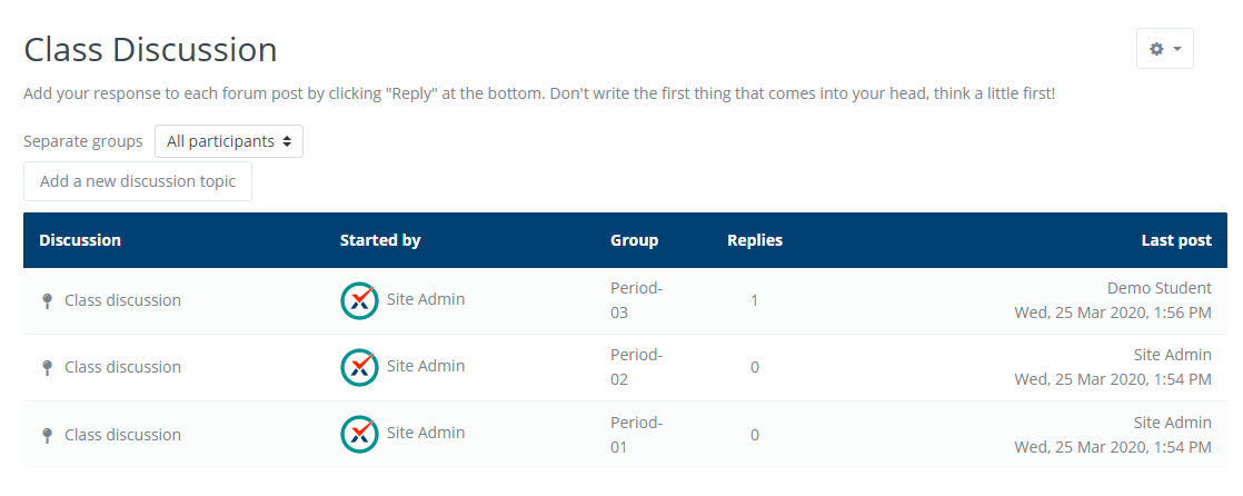 The topic must be posted to "all groups" or created for a single group. Students can post a new topic or discuss a topic posted by others.