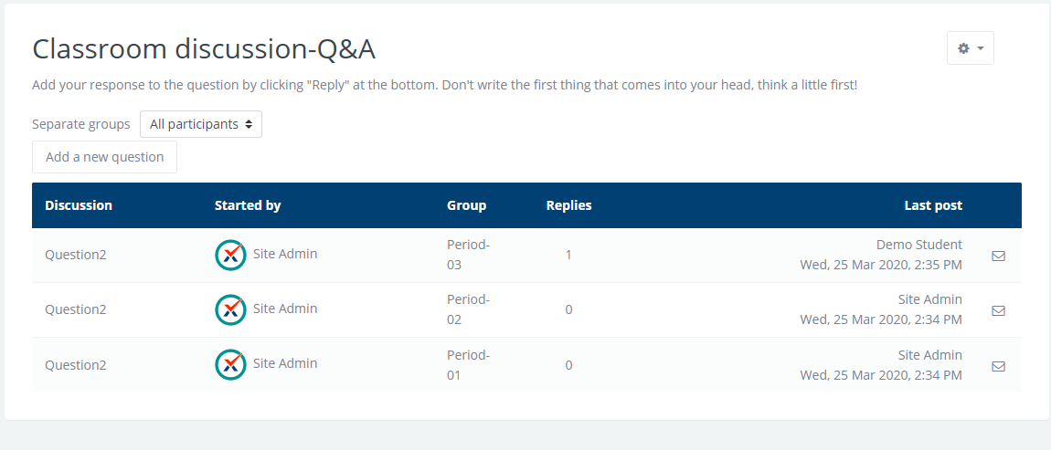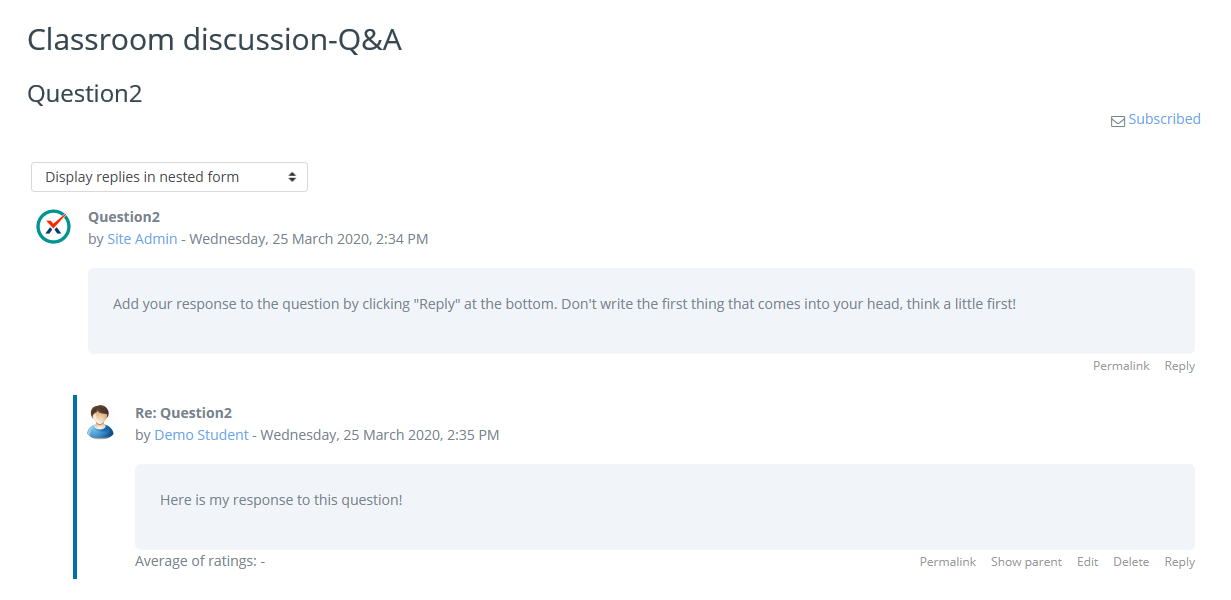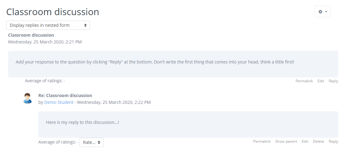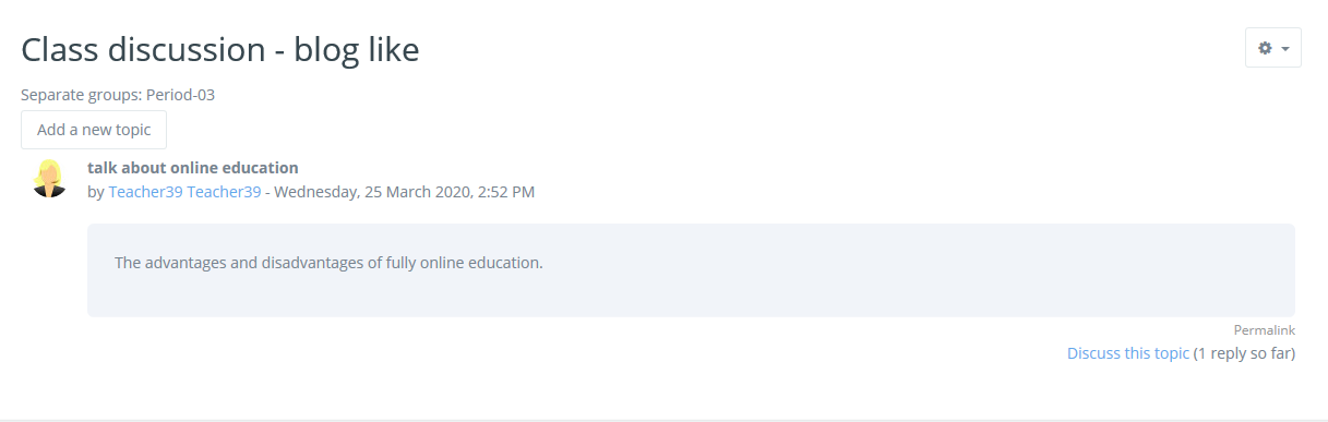 In a Single, simple discussion the teachers posts a question and students are able only to reply. They cannot start a new topic of discussion. This is useful if you wish to keep a discussion focused.