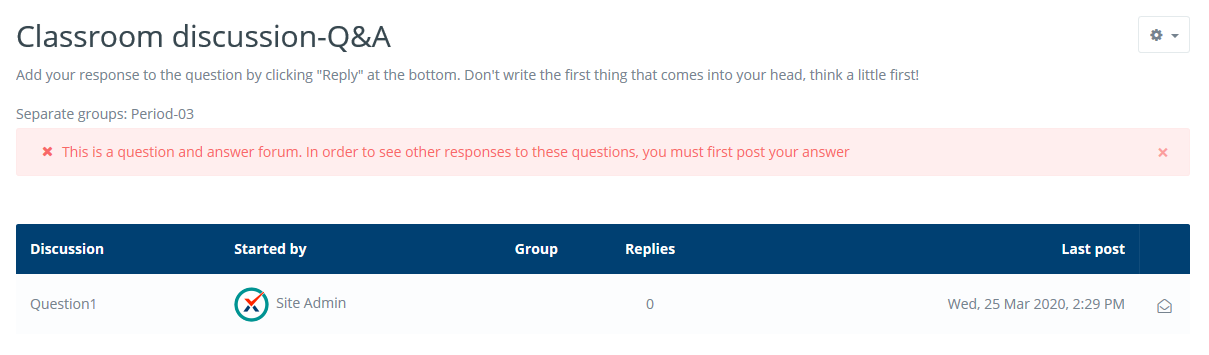 The Question and Answer forum is best used when you have a particular question that you wish to have answered. The teacher posts a question and students respond with possible answers. By default a Q and A forum requires students to post once before viewing other students' postings.