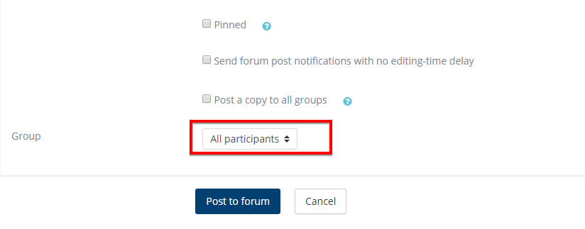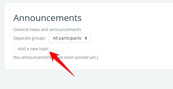 To add a new announcement/topic, use the default "Announcement" activity already created in your course's top section. When adding a post, select "All participants" and leave "post a copy to all groups" unchecked unless you want to make this restricted to group/period members.
