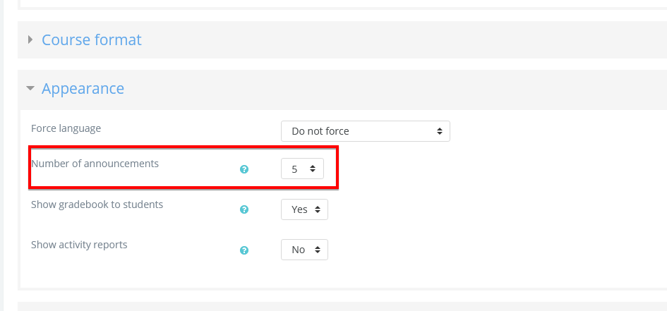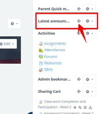 Once you add a new post to your announcements activity, they will appear in the latest announcement block. It is better to turn off the editing to get a better view of how announcements look in the block. By default, the announcement block shows the 5 latest topics. If you want to change that, go to "Course settings" and change the number of announcements under the "Appearance" section.
