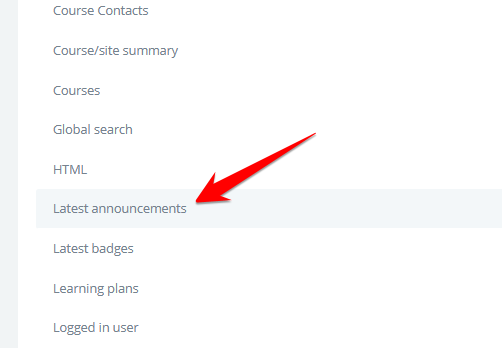 Once you clicked on the latest announcements in the list, the block will be added to your side block area. Make sure the side block area is not hidden on your course. if you do not see the blocks added to the left side, click on the arrow (third screenshot above) to show your blocks.