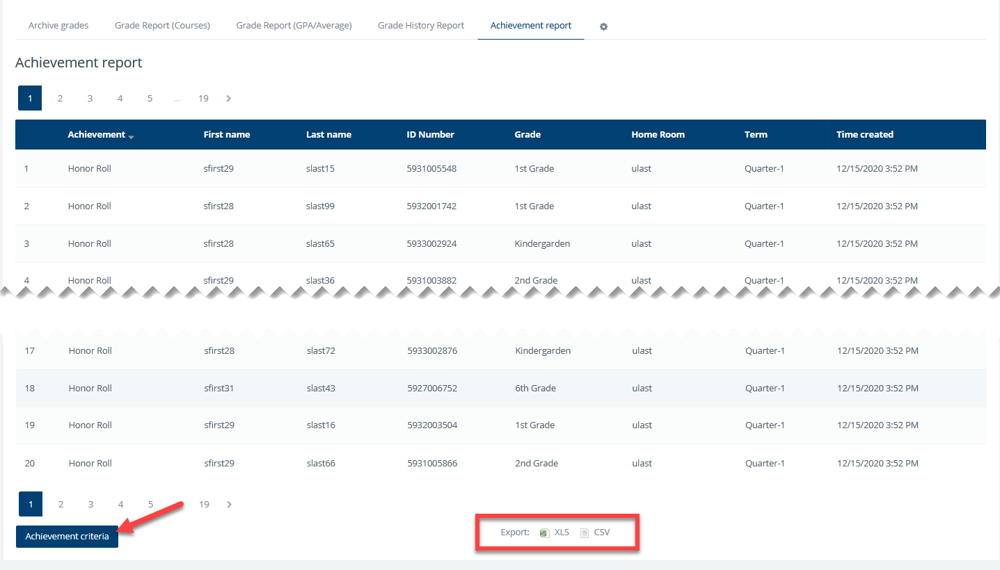 |  The achievement report with the names, ID numbers, grade levels, homeroom and term information of students. |