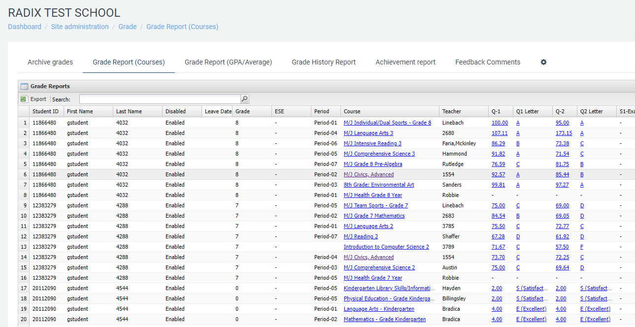Also called "grade report (courses). This report will show the students' term grades, end-of-year course averages, and final grades if any. When you click on a course name on this report, you will be taken to the grade report of that course where you can see all assignment grades for all students. When you click on a grade of a student, you will be taken to the student’s grade report for that course.