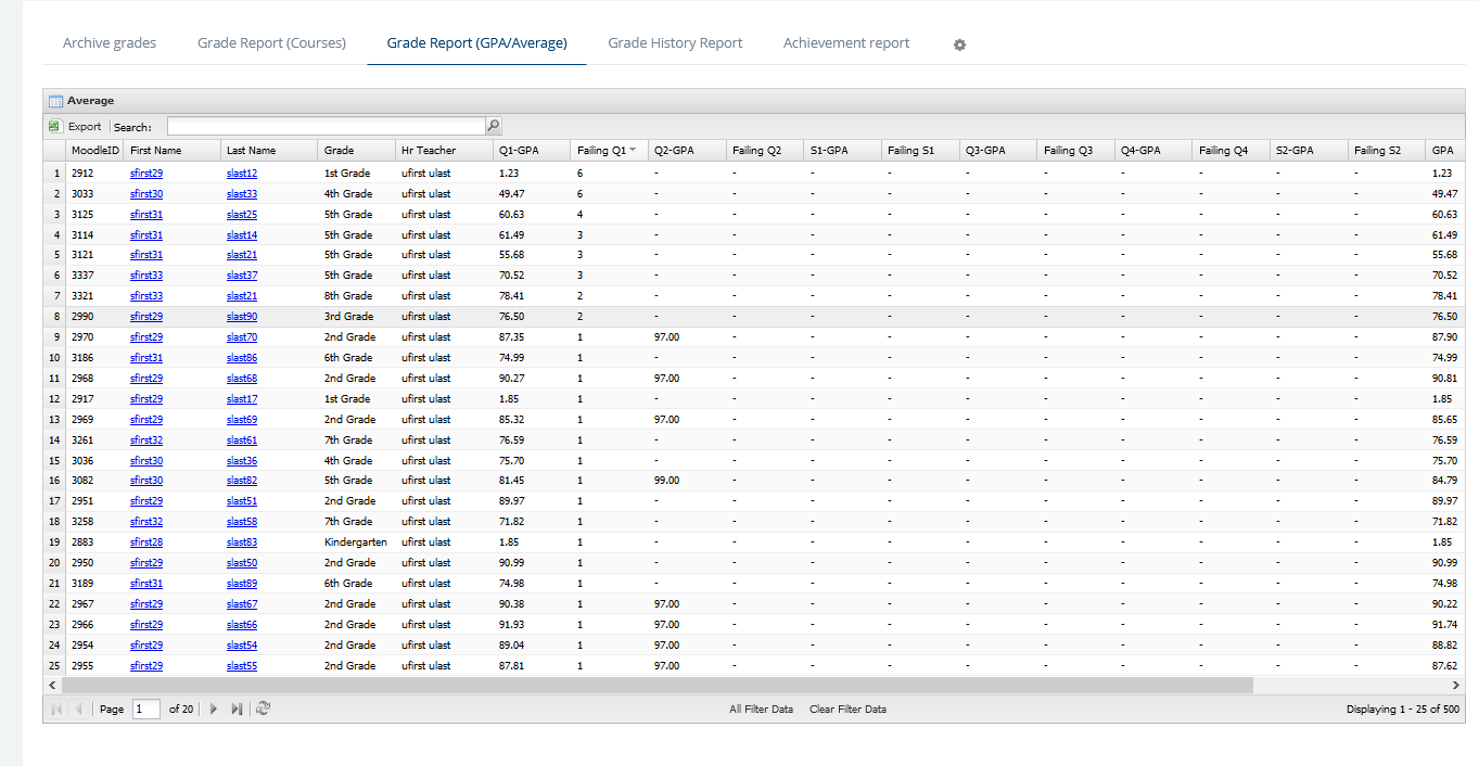 This report will show the simple GPA of the students for each term based on the courses' weights. It will also show the number of failing courses a student has for each grading term. Clicking on the student's name will show the detailed course grades.