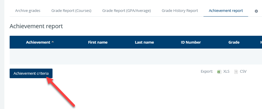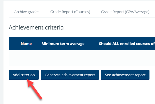 |  1- Go to achievement report under "grade" |  2- Click on "Achievement criteria to see or add/edit them. This screen is where your report will appear once it is generated. |  3- Click "Add criterion" if this is the first time you are adding them. If you already added them, this is the page where they will be listed. |