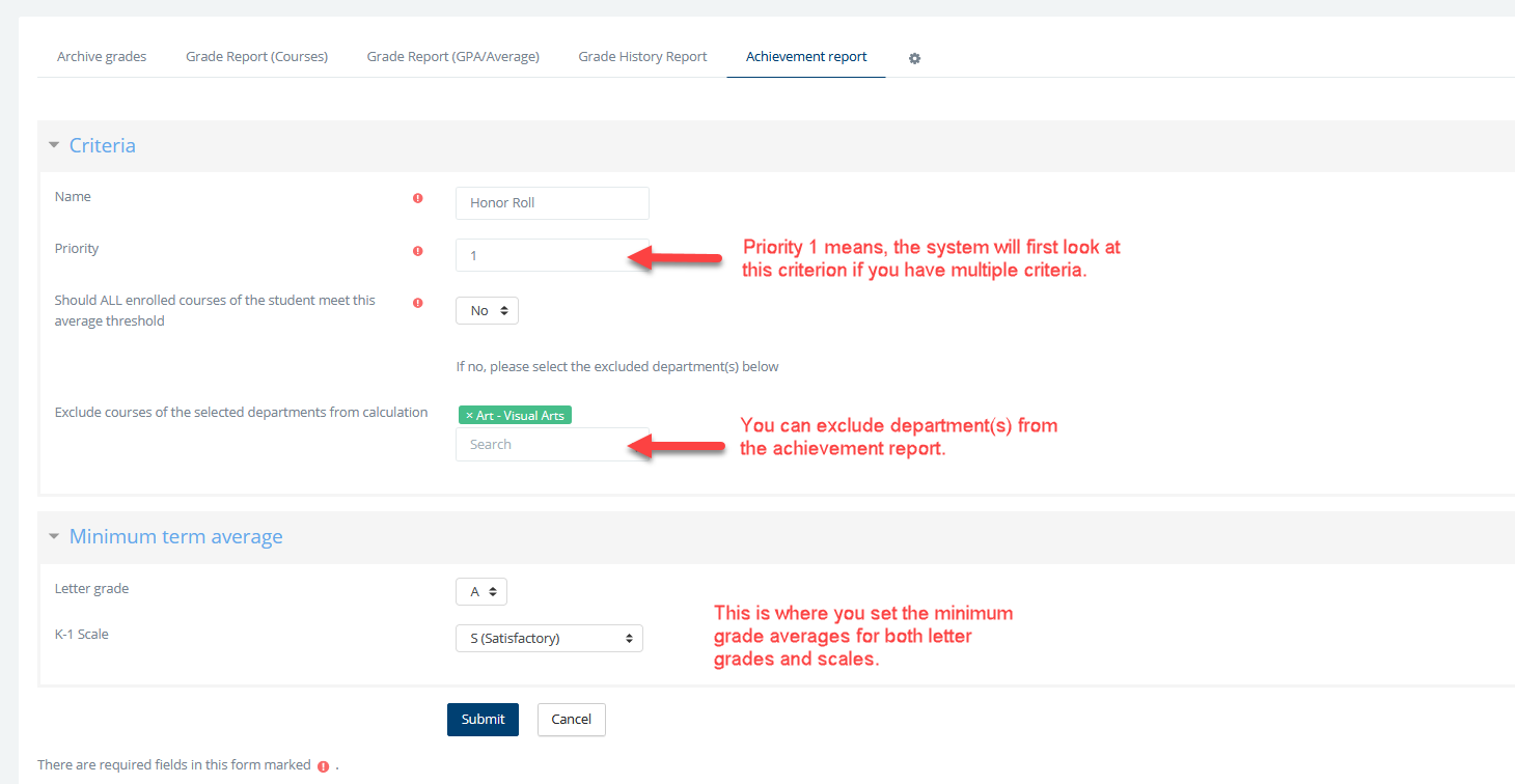 If you are adding multiple criteria, you must prioritize them so that the system knows which one to look for. Higher achievement should always have a higher priority. Priority will make sure that a student only appears in one of the achievement rolls.