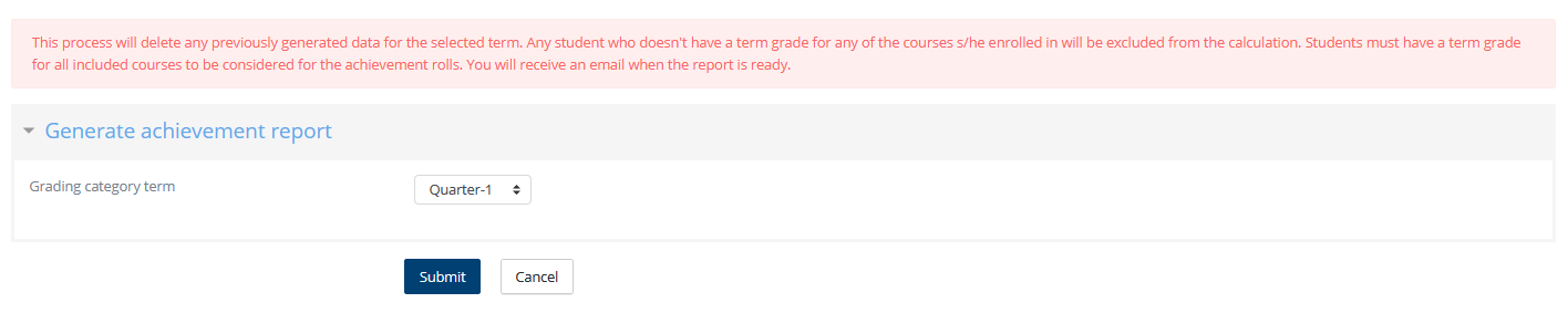 |  To generate your report, select the term and click submit. You can re-generate the report which will erase the previous data for the selected term. |