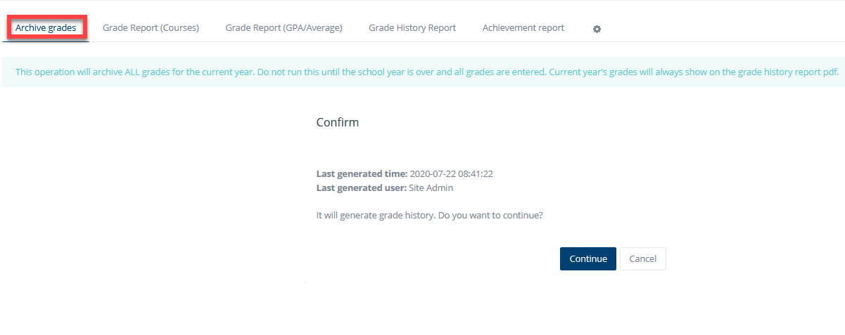 School admin will have to archive the current year's grades once they are finalized. This process will ensure the grades are recorded into the grade history report and available in the following years. This process should not be done during the year which cause the history report to show duplicate records on the pdf. It should only be done after the year is over and the grades are finalized.