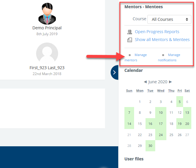 To manage mentors and mentees, click on the "Manage mentors" link on the block.