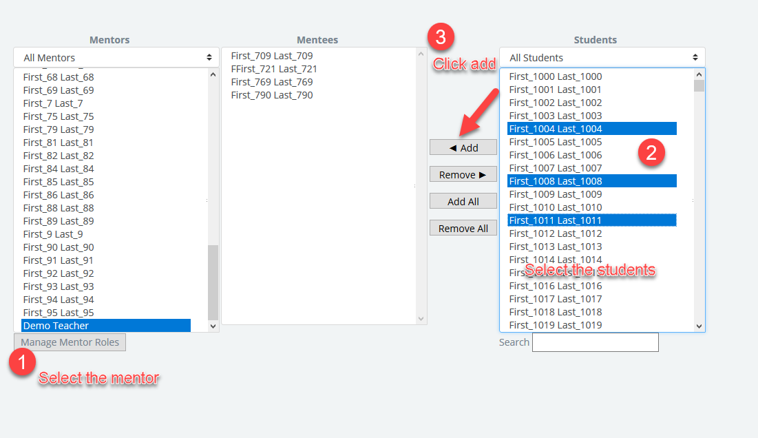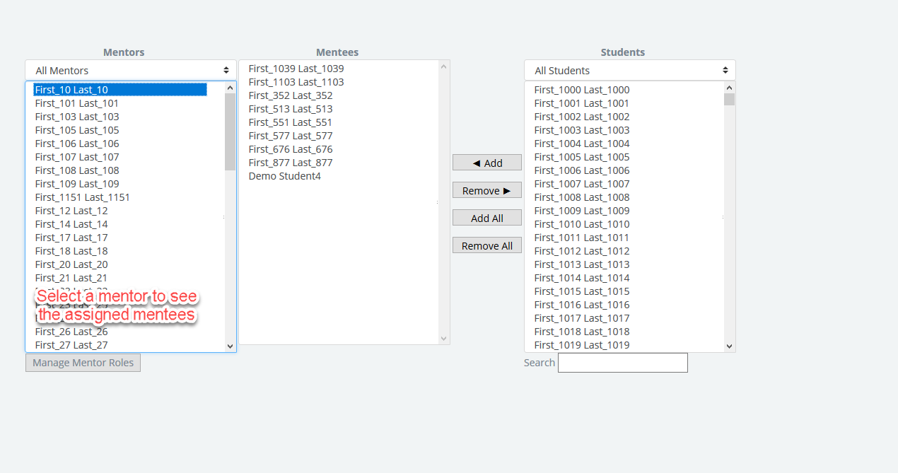 To assign or see the list of mentees assigned to a mentor, click on the name of a mentor. Selected mentor's mentees will appear in the middle window. To assign more students as mentors of the selected mentee, select the available students on the right and click on "Add". You may select multiple students while holding down "Ctrl" (Command on mac) button on your keyboard. To remove a mentee from the list, select the mentee in the middle and click on "Remove"