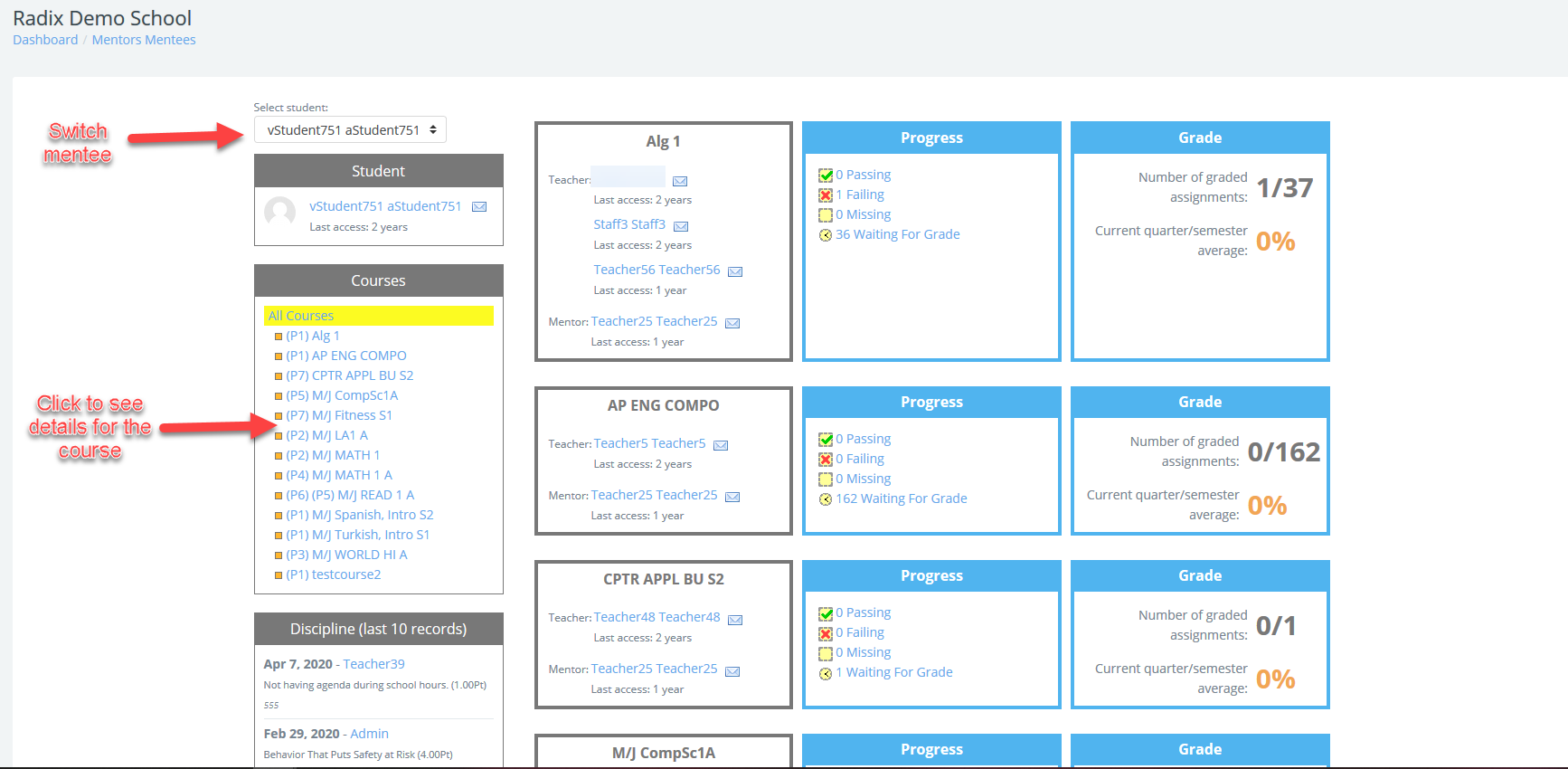 Clicking the student's name will take the mentor to the student's progress page. On this page, you will see the access information, courses enrolled, mentee's academic summary in each course and discipline summary of the last 10 records. Once on this page, the mentor can easily switch between the mentees.