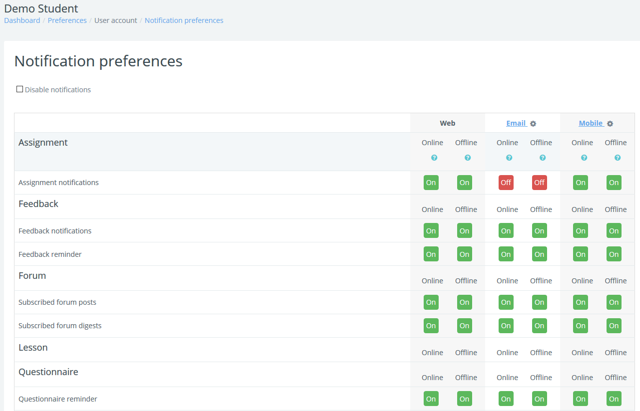 - Notifications alert teachers, students, and other users about events in Radix LMS such as new assignment posts, feedback/grades received, assignments needing grading, or badges awarded.