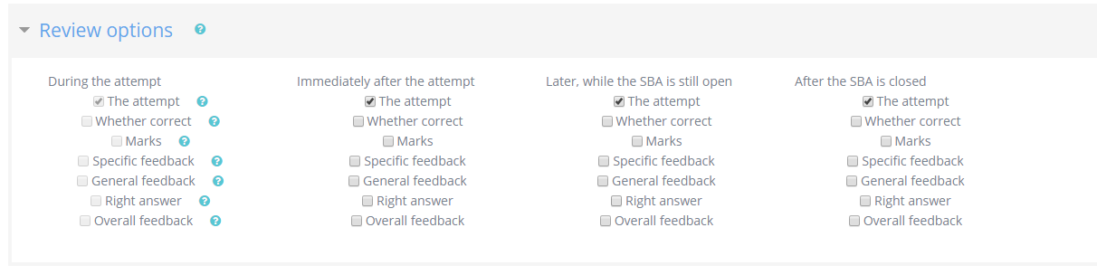 Close the SBA: After the closing time, the students will not be able to start new attempts. Answers that the student submits after the SBA closing date will be saved but they will not be marked. Even after the SBA has closed students will still be able to see the SBA description and review their attempts. What exactly they will see depends on the settings you choose for review options (see below).