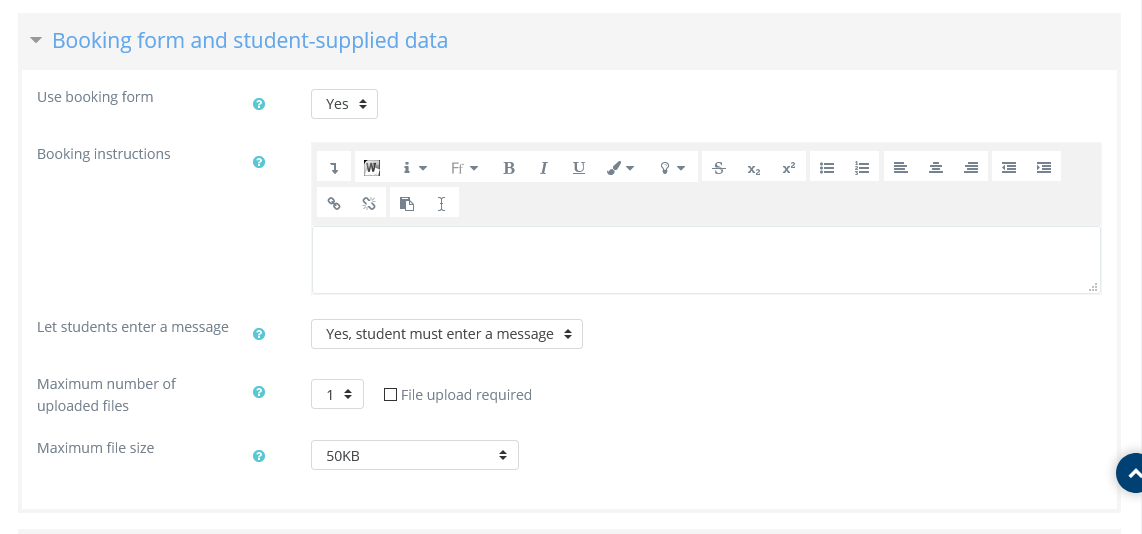 - You can enter a text message which will be shown to students at booking time. Here you should include instructions on what students should enter in the data fields described below.