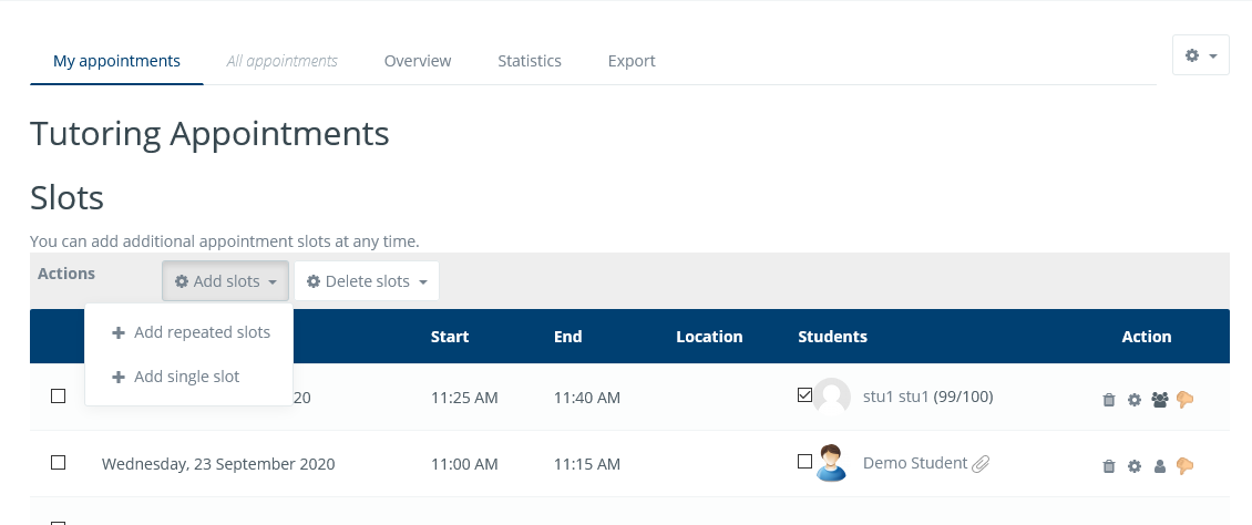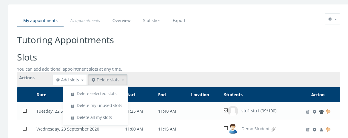 Below the Add and Delete bar, there is a slot table that shows the complete status of the used and available slots. In the My Appointments screen, only the slots belonging to the current user are shown. The free slots show an empty appointment cell, while booked slots show the list of students who are scheduled.