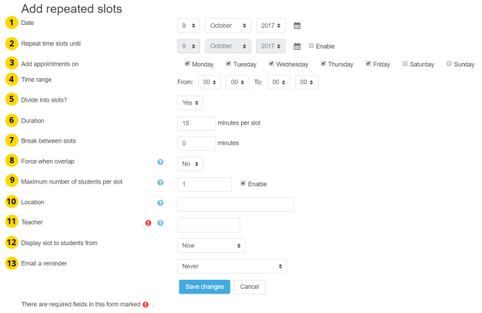 - Using "Maximum number of students per slot" you can specify how many students should be able to sign up for each slot. For one-on-one meetings, this would be 1 student.