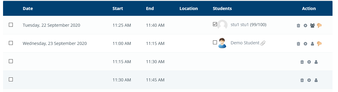 The Scheduler activity helps you to schedule one-on-one appointments with all your students. You specify the periods during which you are available to see the students and the length of each appointment. The students then book themselves into one of the available timeslots. The module also lets you record the attendance and grade the appointment.