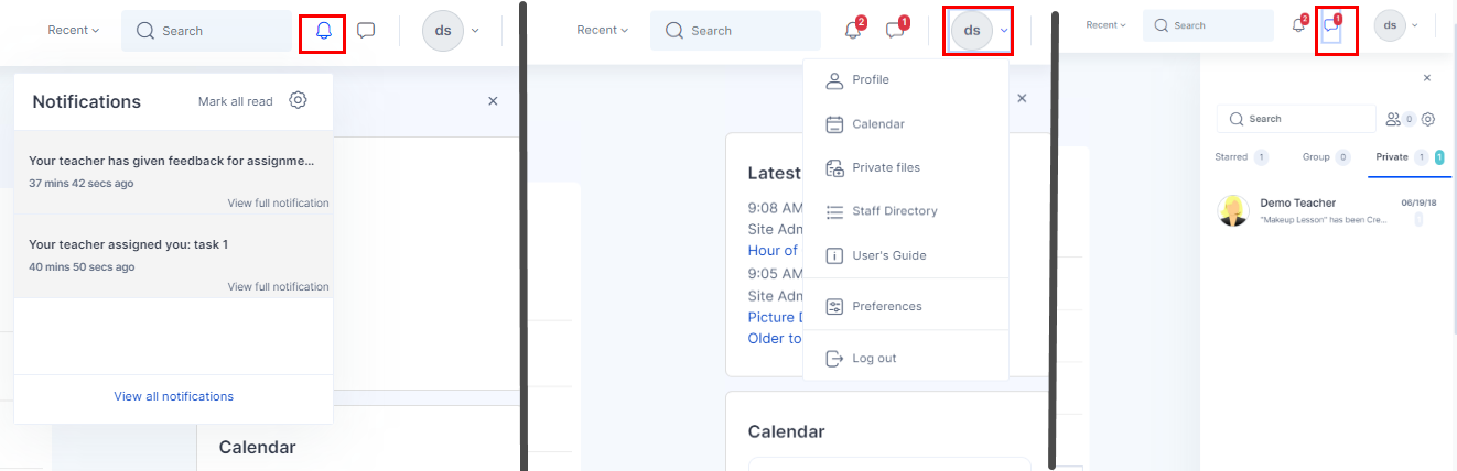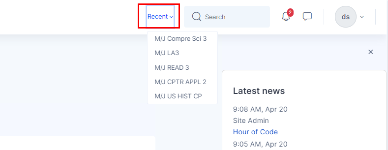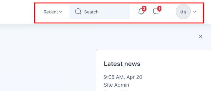 |  | On the right side of the Navbar, you will find your “Recent” menu for the recently accessed courses, site search to search your courses, notification and messaging icons and user menu.  |