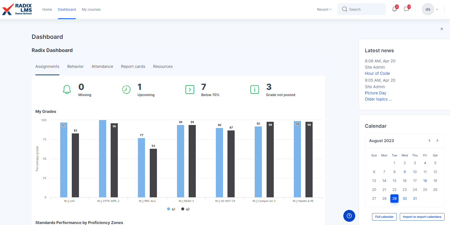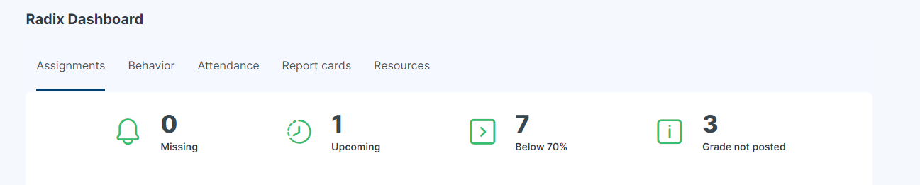 |  | The Radix Dashboard shows the assignment, behavior and attendance snapshots on top. Clicking on the numbers will take you to the detailed list of those categories. You can also access your report cards page from these tabs.  The student's current grade average for the current and past terms can be found in my grades section in a graphical format. Clicking on the bars in the graph will take you to the grades summary page where you can check the detailed grades for each course. |