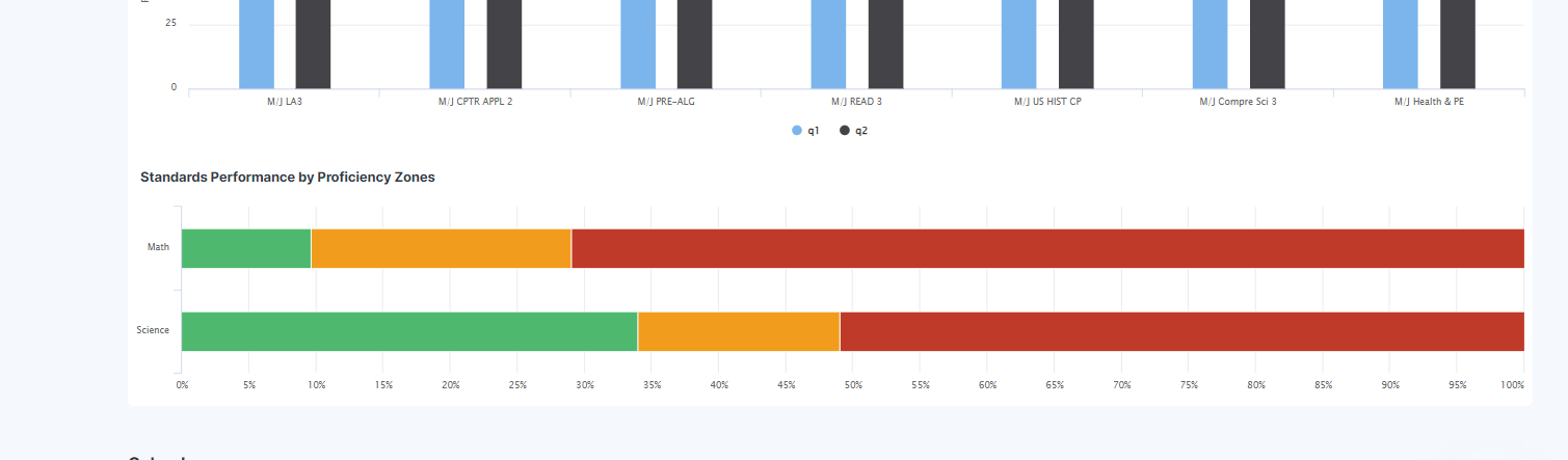 |  | If administered at your school, standards performance by proficiency zones will show the student's performance on the latest benchmark tests. Click on the bars to access the detailed report. |