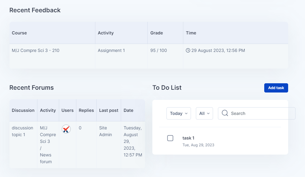 |  | The bottom section of the content area on the dashboard has the Recent Feedback, Recent Forums and To Do List blocks. Recent feedback shows the recently graded work Recent forum is for the forum discussions you are active in your courses And the To Do List is the list of tasks created by you or your teachers as a reminder. |