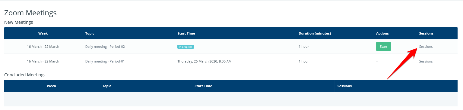 Here you will see the detailed information about your zoom meeting. Start/Join link, ical integration, link to the sessions and all of your meetings.