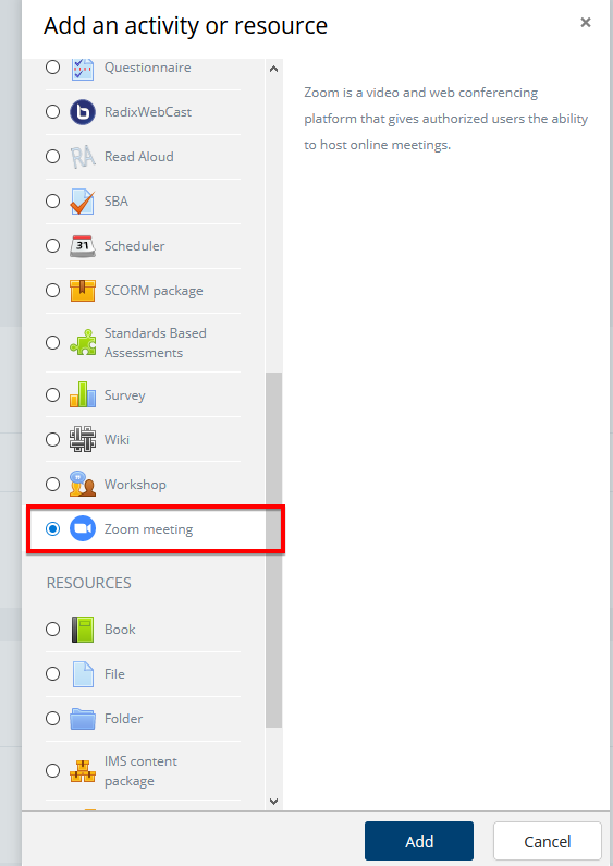 - Select Zoom meeting from the Add an activity or resource pop-up window.
