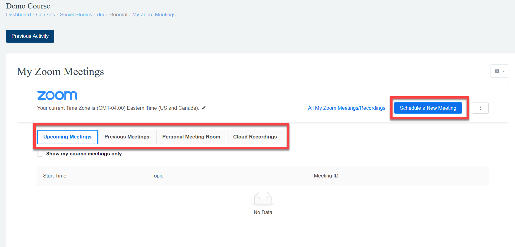 5. Once you click on save and display, the Zoom menus will be displayed as embedded into your course. From this point on, you can schedule a new meeting, access previous meetings, cloud recordings, or your personal meeting room without leaving the Radix LMS site.