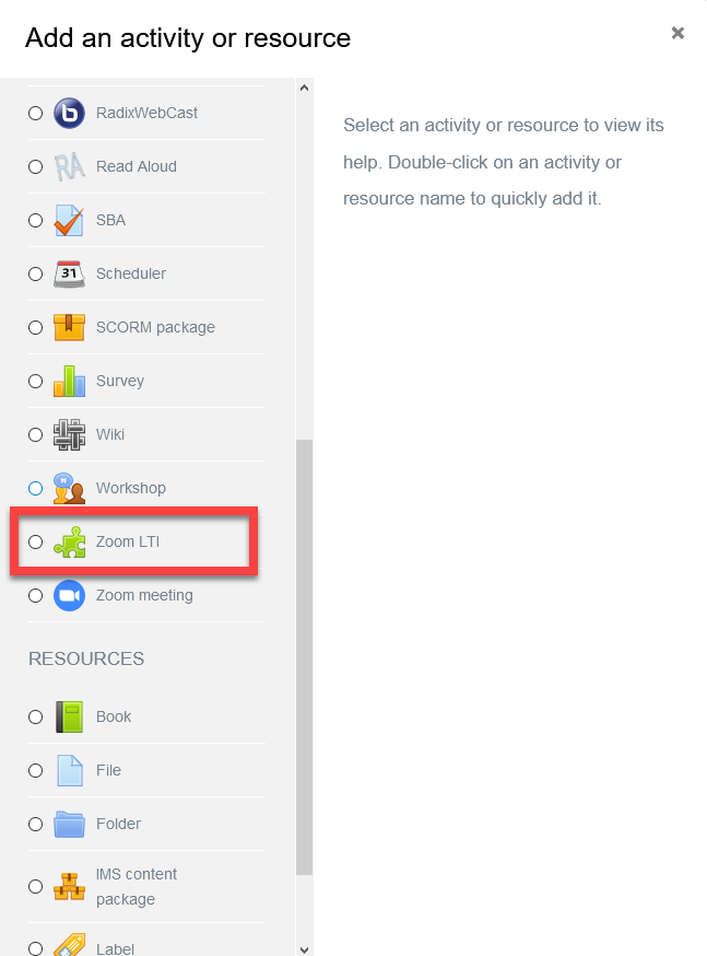 - Select Zoom LTI from the Add an activity or resource pop-up window and click Add.